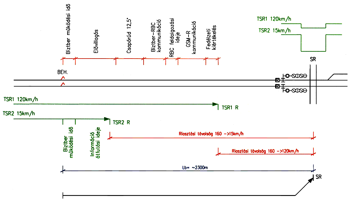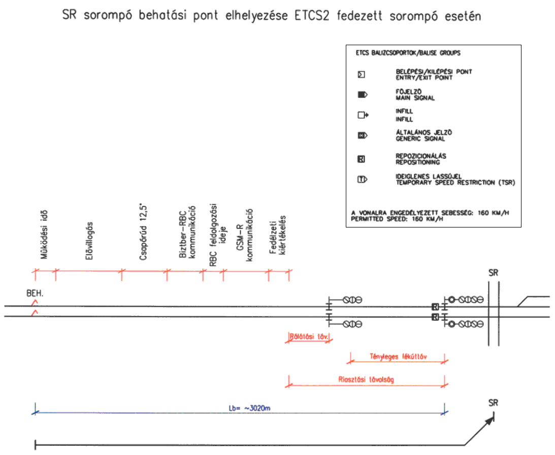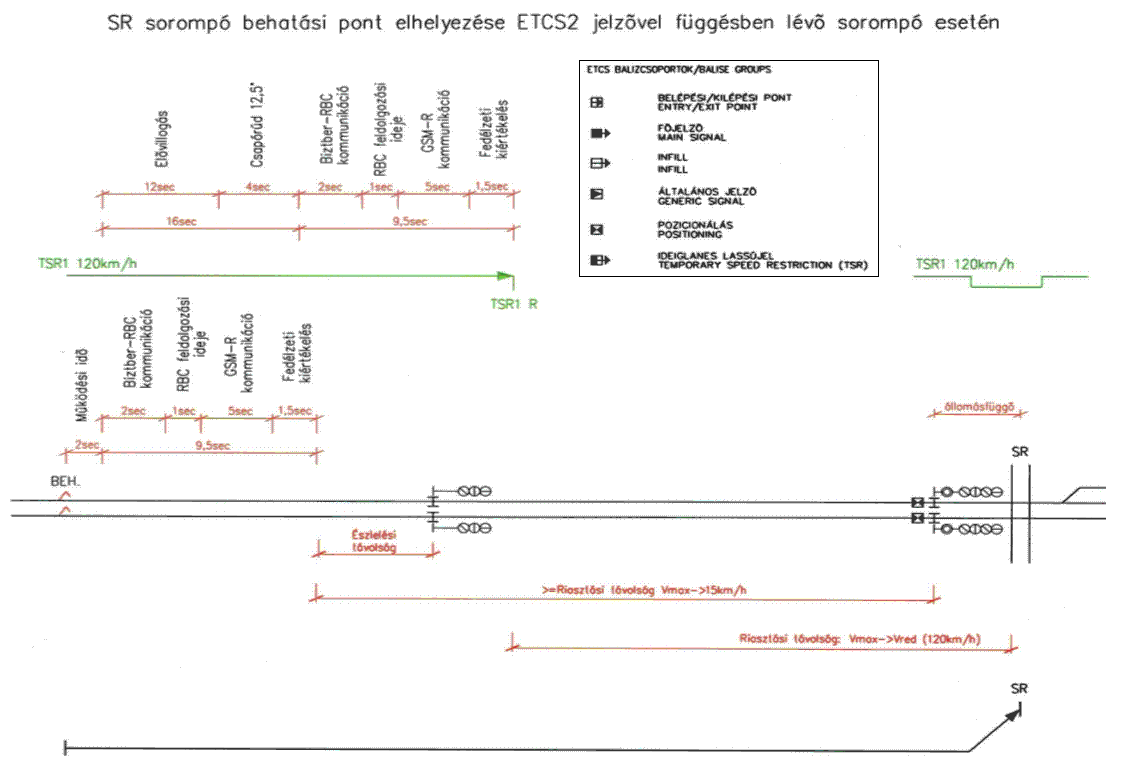 Ha a v(red) az infill balízzal már nem biztosítható (az üzemi fékezés biztosan), a vonali sorompó állomásfelőli behatási pontját a jelzővel ellenőrzött állomási sorompó elvei szerint meg kell hosszabbítani. A különböző vágányutak esetében a balízokba táplált TSR illetve TSRR táviratok képzésének elvét az 1. táblázat tartalmazza.
