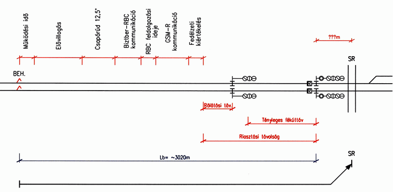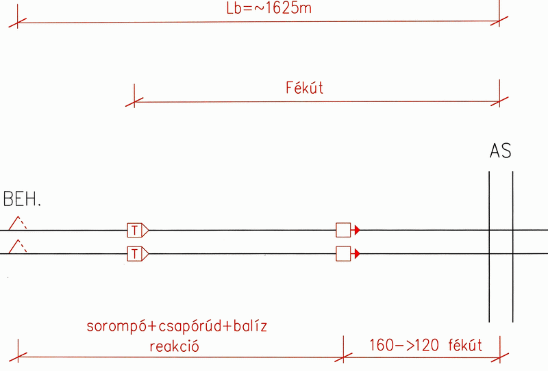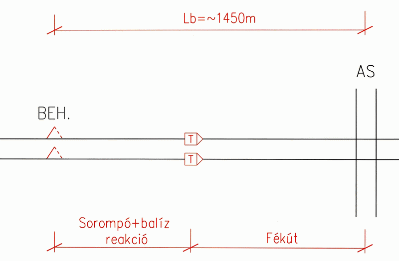 1. Abban az esetben, ha a csapórúd ellenőrzése (az első vonatnál) nem szükséges, az ábrának megfelelően a bekapcsoló elem távolsága a balíztól a sorompó és a balíz működési ideje alatt megtett út. Ennek megfelelően a behatási pont távolsága közelítőleg 1450m.