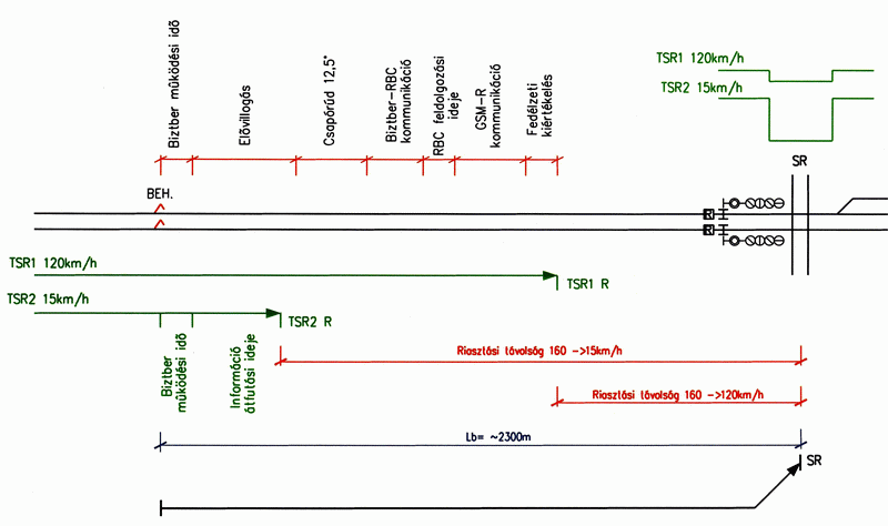 ETCS 160km/h-ról 15km/h-ra történő fékezés riasztási távolsága: 1800m
