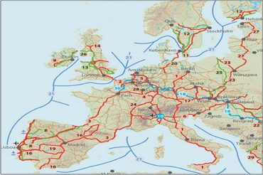 Helsinki - Vyborg - St. Petersburg - Pskov - Moszkva - Kaliningrad - Kiev - Ljubashevka/Rozdilna (Ukrajna) - Chişinău - Bukarest - Dimitrovgrad - Alexandroupolis. Kiágazik Ljubashevka/Rozdilna felől Odesa felé
