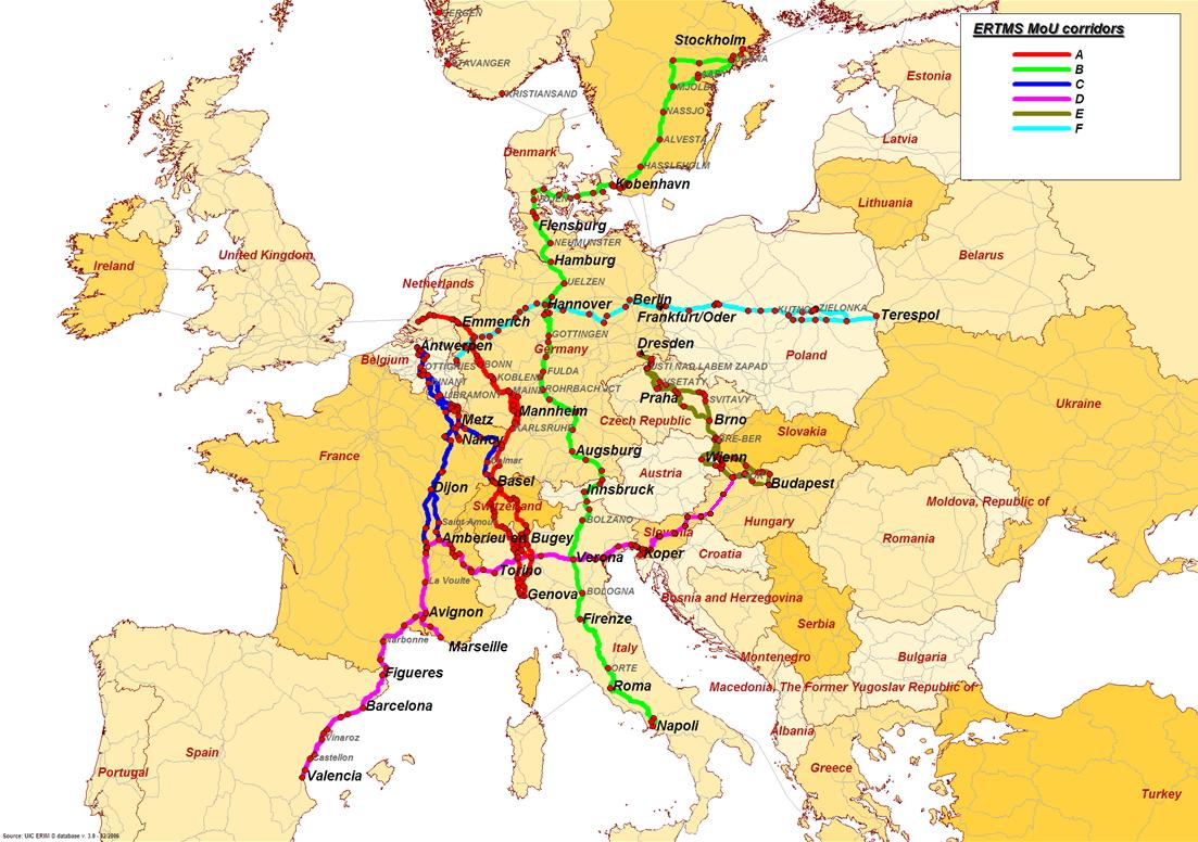 2005. július 7-én Karel Vinck személyében ki is nevezik az első európai ERTMS koordinátort. Július 11-én az ERTMS MoU Steering Group első ülésén meghatározásra kerül a hat ERTMS korridor. A cél nem teljesen új, eddig le nem fedett vasútvonalak látókörbe vonása volt, hanem a korábbiakban meghatározott (TEN, Pán-Európai, TINA és egyéb) korridorok közül azon, az európai teherszállítási viszonylatban meghatározó magnak a lehatárolása, amelyre a korlátozottan rendelkezésre álló EU-forrásokat összpontosítani szükséges a mielőbbi piaci siker érdekében. Ennek megfelelően az A-tól F-ig jelölt ERTMS korridorok hosszban az európai hálózat csak mintegy 6%-át teszik ki, ám ezen zajlik a teljes teherforgalom több, mint 20%-a.