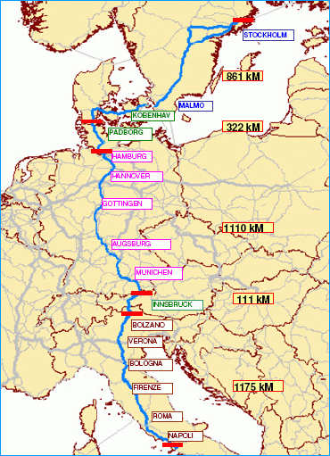 Salzburg - Ljubljana - Zágráb - Belgrád - Niš - Skopje - Veles - Thessaloniki.