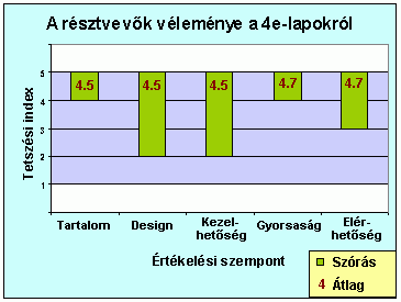 A résztvevők véleménye a 4e-lapokról általánosságban jónak mondható. A legrosszabb "érdemjegyeket" a design és a kezelhetőség kategóriájában kapták a lapok, jóllehet az átlag mindkét esetben 4.5 körül mozog. A honlap fejlesztése kapcsán minden kritikát továbbra is szívesen fogadunk a Vendégkönyvben, vagy az admin@etcs.hu e-mail címen.
